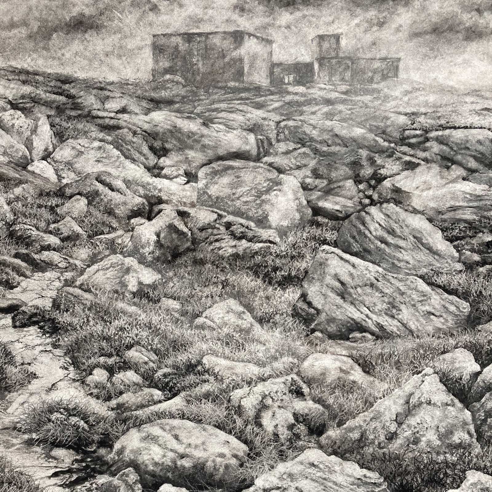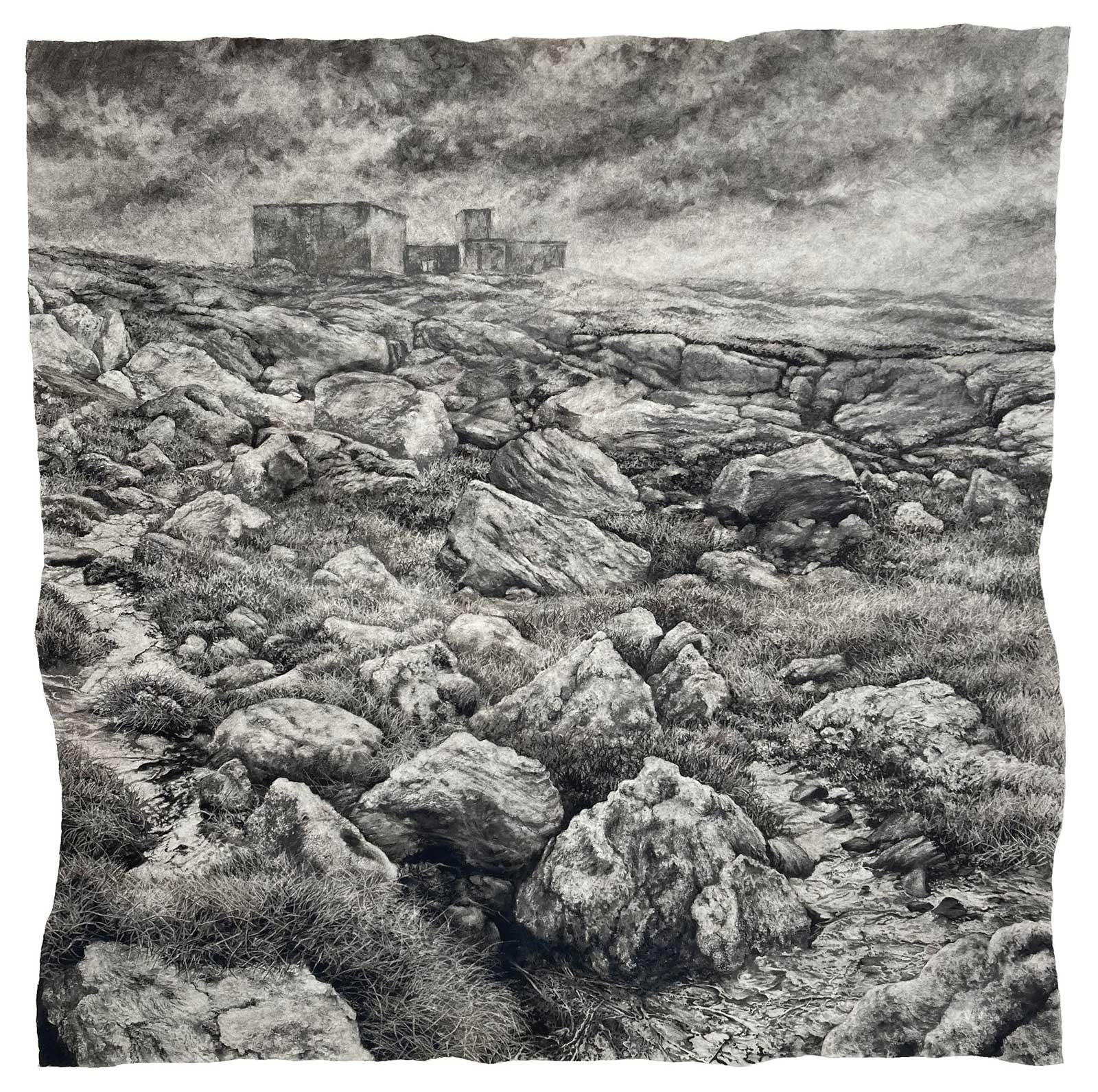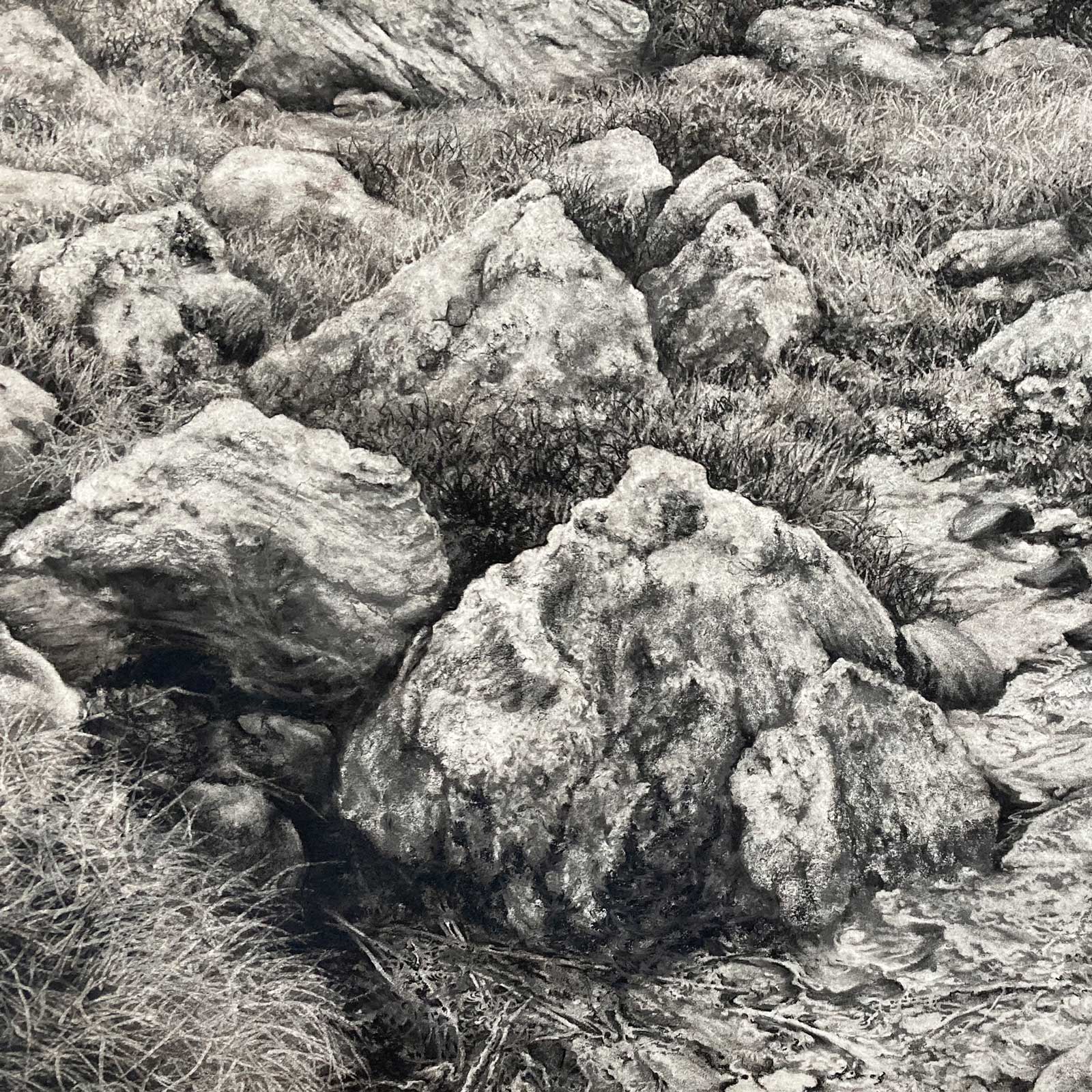 Whilst living and working in the Yorkshire Dales, the conservation of the peat moorlands and fens became an underlying purpose to her work. Responding to the rich surfaces, textures and relationships between the immense ranges of living layers amongst the hard structures of the rigid limestone. With thought and time, the modest, immense sensitivity and dexterity of charcoal and graphite on paper, allowed her to communicate the importance for conserving these special places.